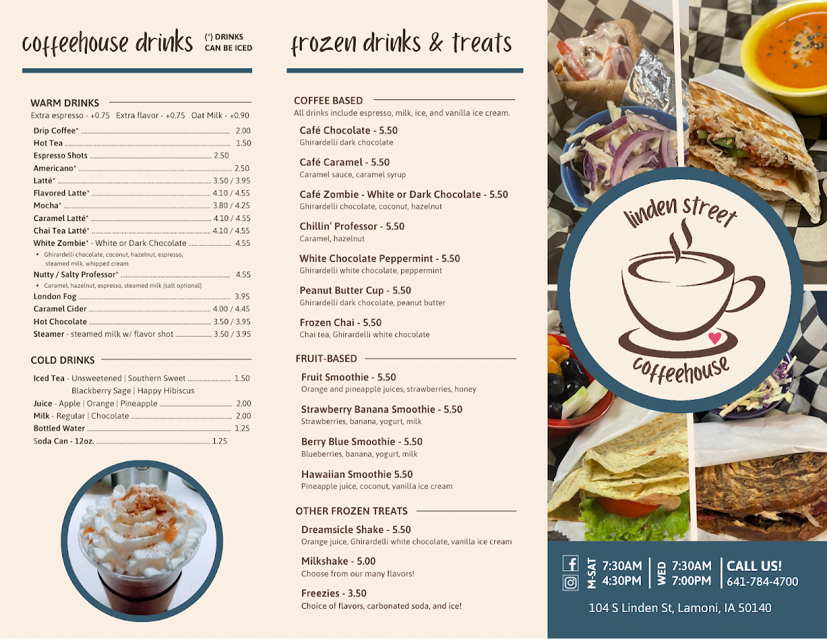 Welcome to Linden Street Coffeehouse, a charming gem nestled in Lamoni, Iowa. This cozy coffee shop exudes warmth and community spirit, making it the perfect pit stop for those on the go. The menu is a delightful blend of beverages and hearty meals that cater to all tastes.